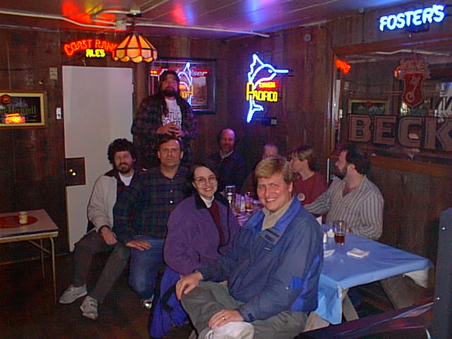 The whole crowd. Working around the table from the front: Brian, Charlotte, Geoff, Bob O'Brien, Andy, Bob Christ, Lenore, Elaine and The Device.