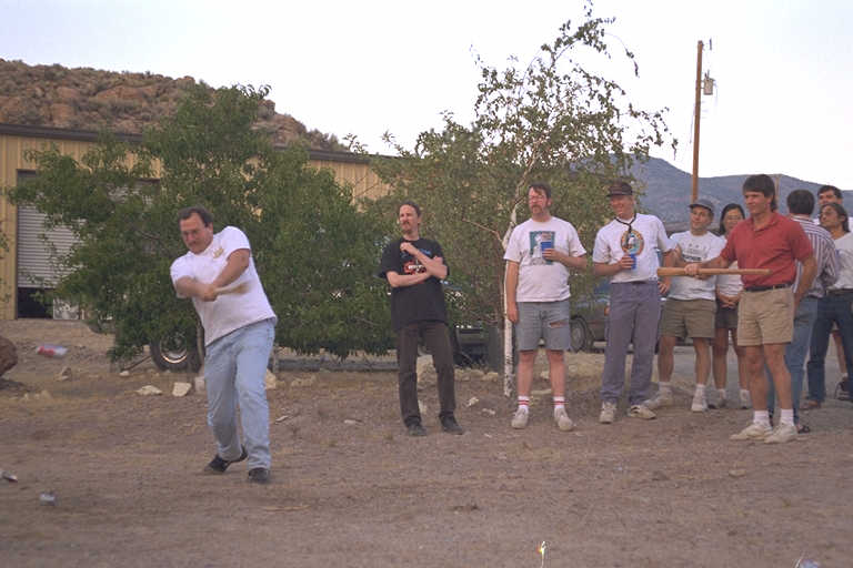 Roger takes a swing while Matt, Marty, John, Jerry and others look on.
